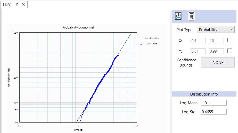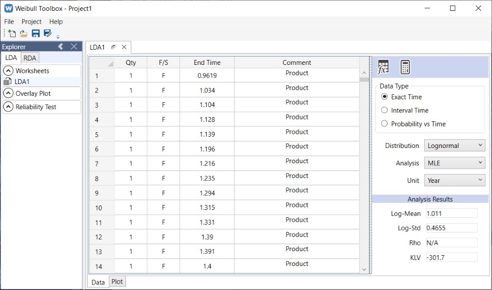 The dataset is transferred to Worksheet in Weibull Toolbox software, and fitted with Lognormal distribution using MLE analysis: