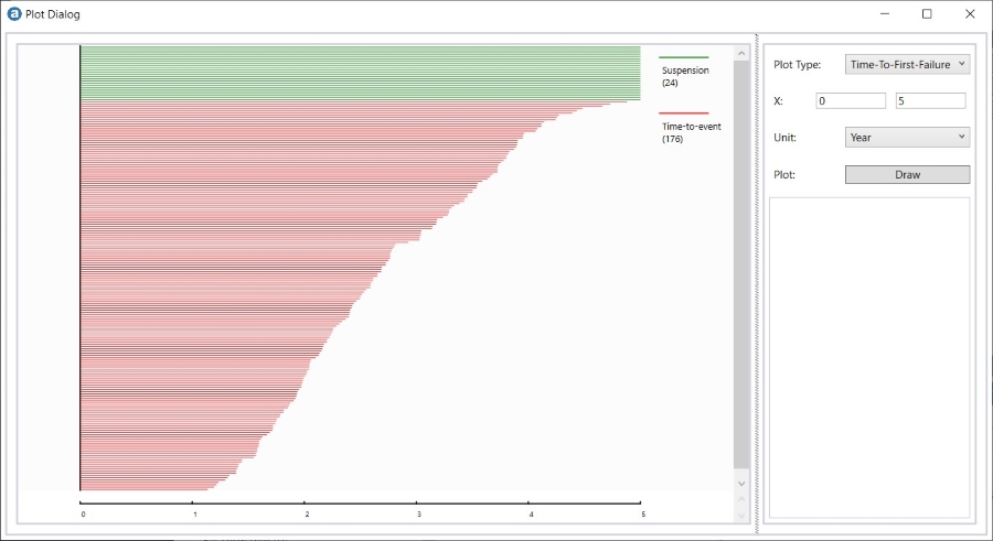 The red and green lines represent the Time-To-Failures and Suspensions respectively.